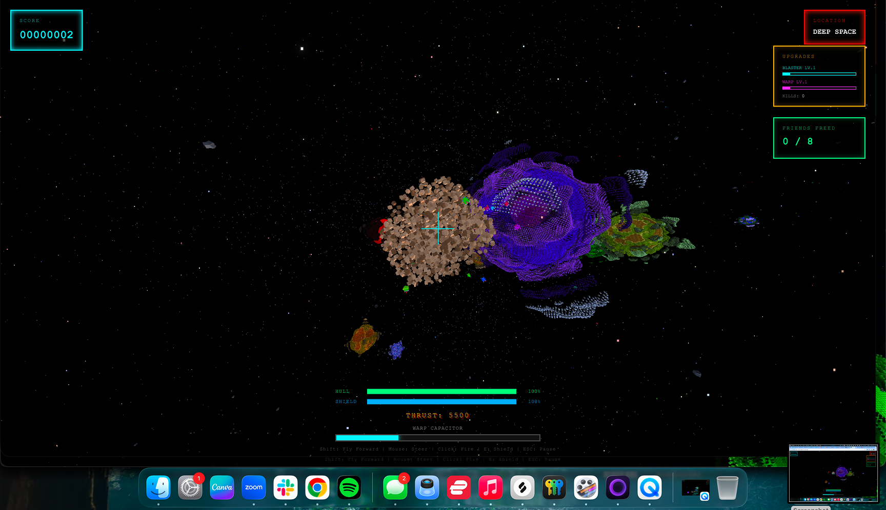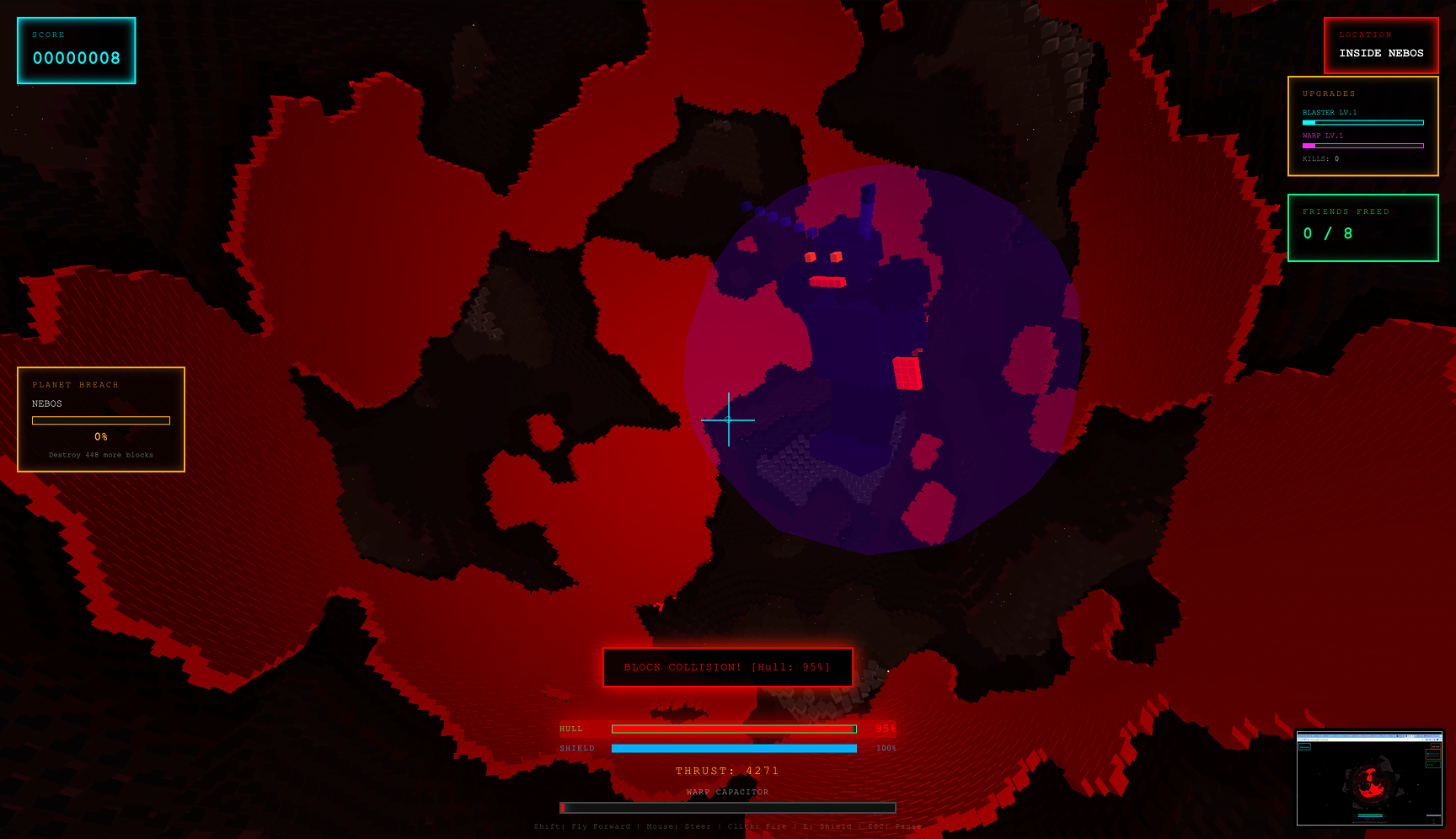 Kill alien guardians to upgrade your blaster, warp drive, shields, and blast radius. Dodge enemy fire across a handcrafted synthwave soundtrack generated in real-time. Warp between star systems. Free all eight. Become the Liberator.